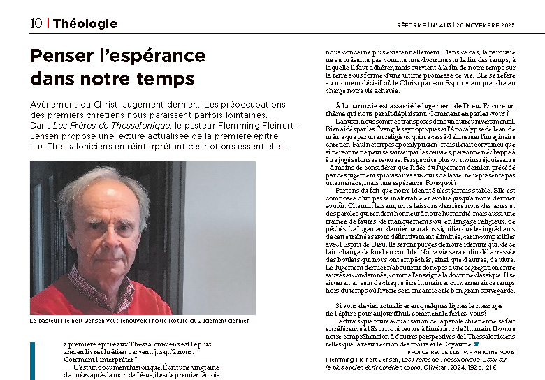 Avènement du Christ, Jugement dernier... Les préoccupations des premiers chrétiens nous paraissent parfois lointaines. Dans Les Frères de Thessalonique, le pasteur Flemming Fleinert-Jensen propose une lecture actualisée de la première épître aux Thessaloniciens en réinterprétant ces notions essentielles.